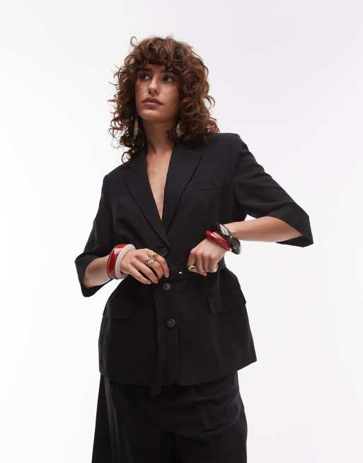 Mango – Czarna elegancka marynarka z krótkimi rękawami i paskiem, część zestawu