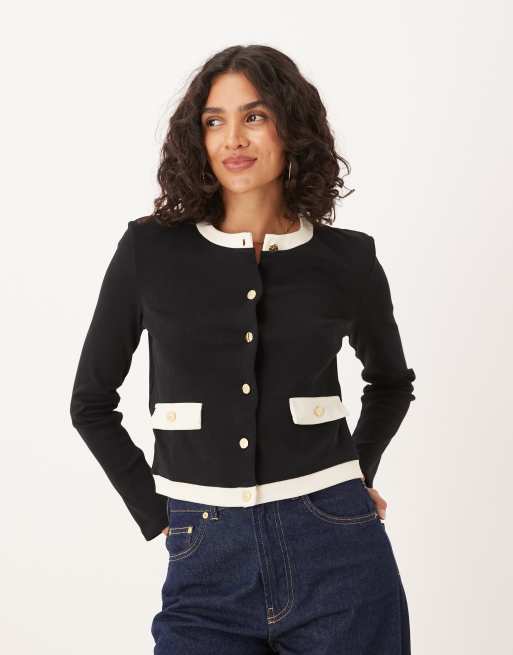 Mango – Czarno-biały kardigan z zapięciem na złote guziki i kontrastowymi lamówkami, 100% bawełna