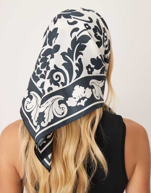 Mango – Czarny satynowy szalik w kwiatowy wzór