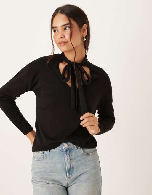 Mango – Czarny sweter z dekoltem V i wiązaniem przy szyi