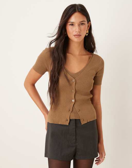 Mango – Dwuwarstwowy kardigan z krótkimi rękawami z dzianiny o delikatnym splocie w kolorze toffi