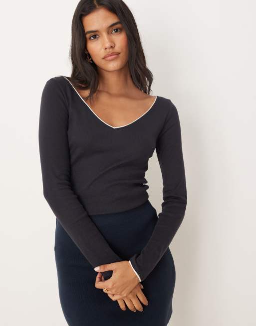 Mango – Granatowy top z delikatnej dzianiny bez kołnierza z długimi rękawami i kontrastową lamówką