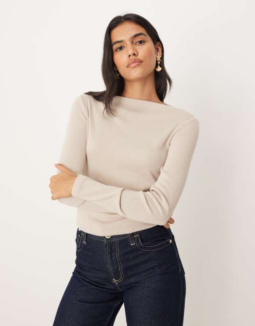 Mango – Jasnobrązowy top z długimi rękawami i dekoltem w łódkę