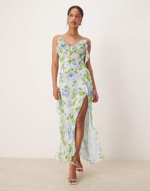 Mango – Jasnoniebieska sukienka z rozcięciem z boku, dekoltem w szpic i falbanką w botaniczny wzór