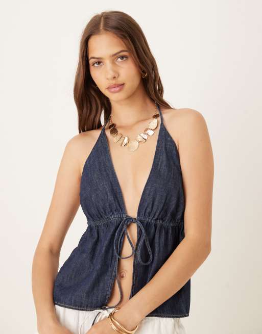 Mango – Niebieski top z dekoltem halter z odkrytymi plecami