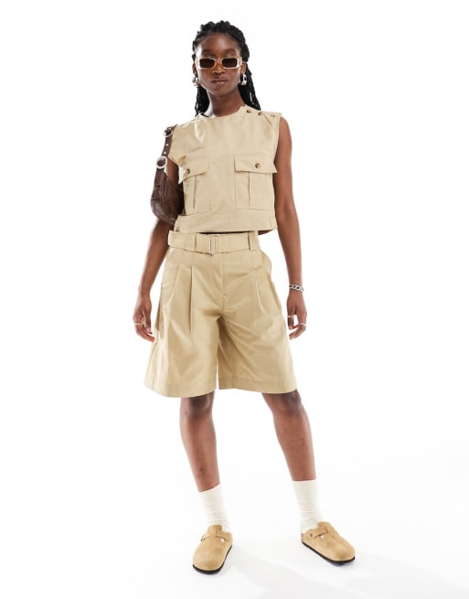 Mango – Piaskowy zestaw w stylu roboczym: top bez rękawów i szorty bermudy