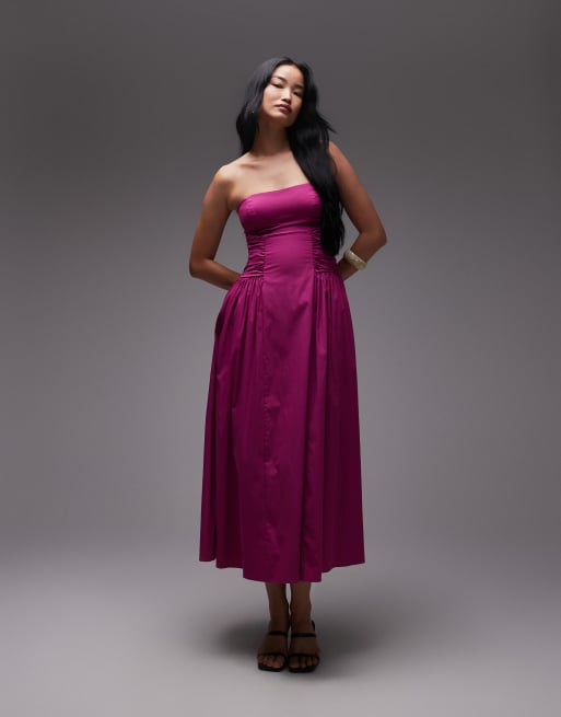 Mango Premium x Kaia Gerber – Malinowa marszczona po bokach sukienka bawełniana midi z dekoltem bandeau