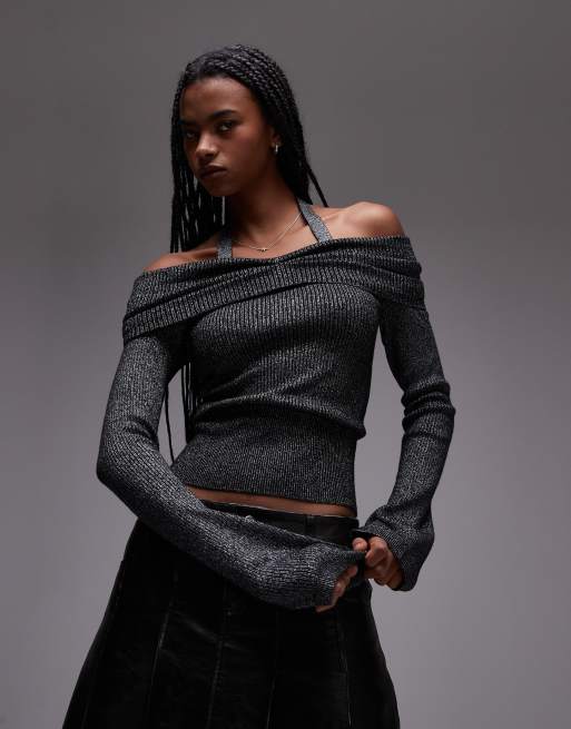 Mango – Szary dzianinowy top z długimi rękawami dekoltem bardot typu halter