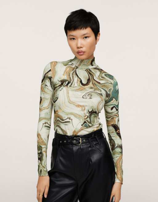 Mango – Top z długimi rękawami z siateczki w zielony marmurkowy wzór
