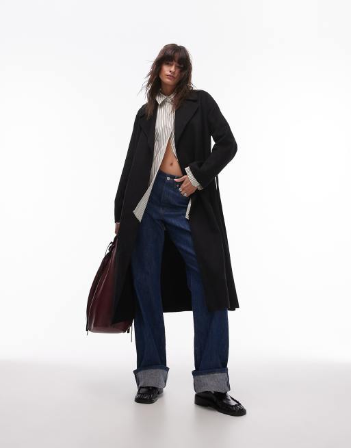 Mango – Wiązany w talii czarny wełniany płaszcz