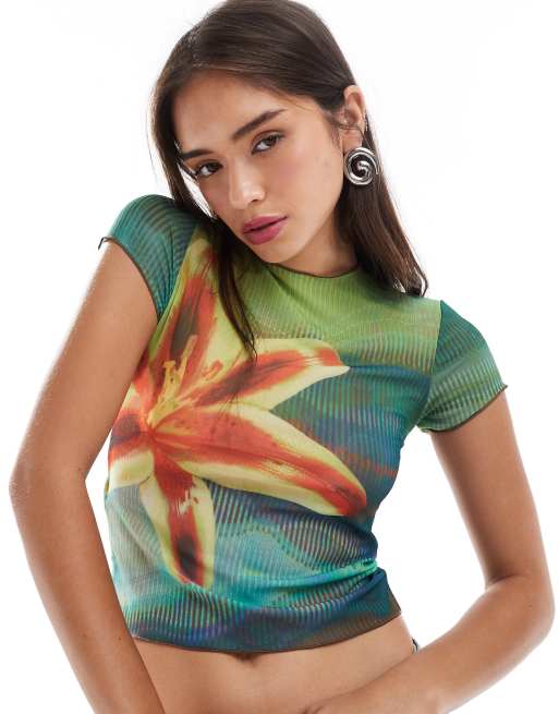 Mango X Siedres – Niebieski T-shirt z falowanym brzegiem we wzór z motywem kwiatu