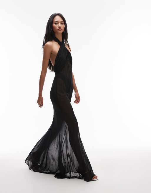 Mango x Supriya Lele – Czarna sukienka maxi z drapowanym dekoltem halter i prześwitującą wstawką