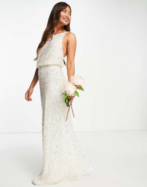 Maya Bridal – Suknia ślubna maxi z odkrytymi plecami wyszywana cekinami 3D w kolorze kremowym na całej powierzchni