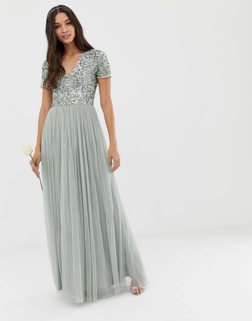 Maya – Bridesmaid – Tiulowa sukienka maxi z dekoltem w serek i cekinami w kolorze szałwii