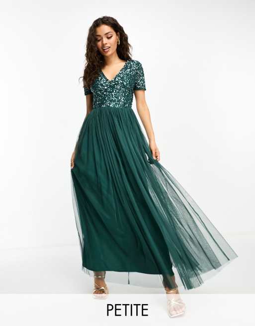 Maya Petite – Szmaragdowa tiulowa sukienka maxi z krótkimi rękawami i cekinami