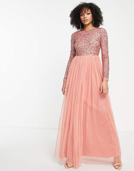 Maya – Sukienka maxi z tiulu z długimi rękawami i delikatnymi cekinami w kolorze spalonego bursztynu