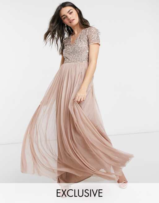 Tiulowa sukienka maxi dla druhny Maya z dekoltem w serek i delikatnymi cekinami, pudrowy