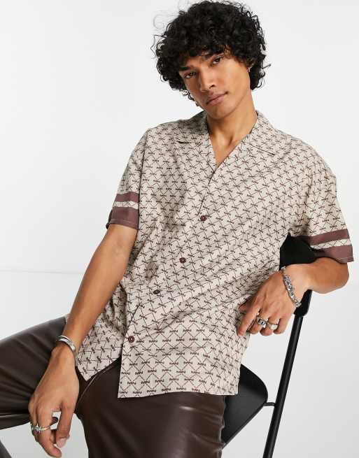 Mennace – Jasnobrązowa koszula z krótkimi rękawami, kołnierzykiem kubańskim i monogramem