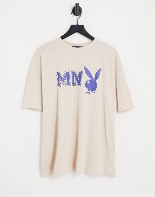 Mennace x Playboy – Kremowy T-shirt z nadrukiem z logo na piersi i plecach