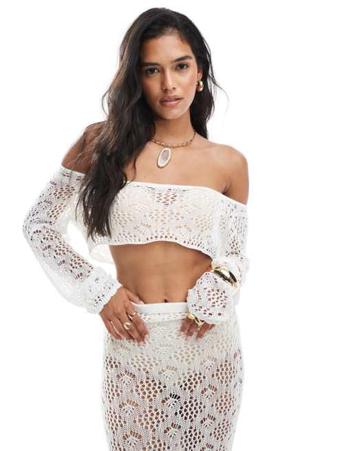 Miss Selfridge – Bardzo krótki szydełkowany top plażowy z długi rękawem w kremowym kolorze