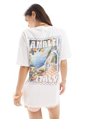 Miss Selfridge – Biały T-shirt oversize z letnią grafiką z napisem „Amalfi“