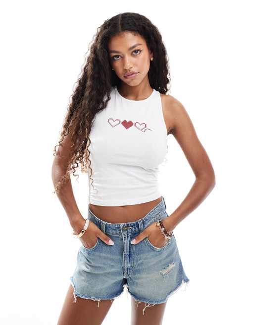 Miss Selfridge – Biały top o fasonie bokserki z sercami z krzyżykowym ściegiem