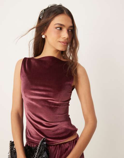 Miss Selfridge – Bordowy aksamitny top z o fasonie bokserki z prostym dekoltem