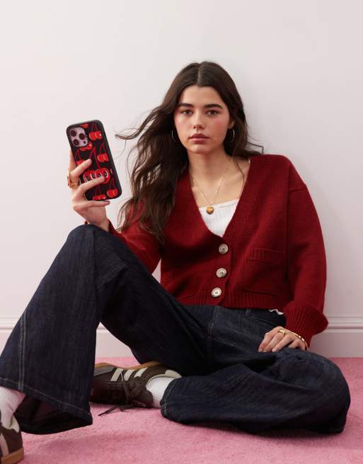 Miss Selfridge – Bordowy kardigan o pudełkowym kroju z ozdobnymi szwami