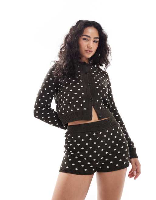 Miss Selfridge – Brązowy dzianinowy zestaw w groszki: szorty i kardigan