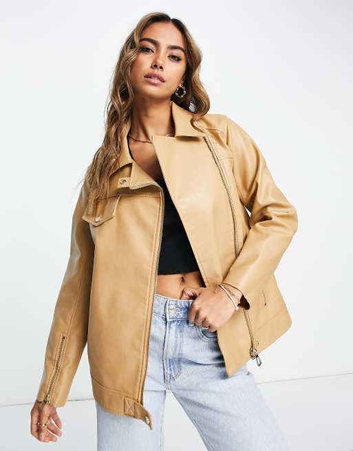 Miss Selfridge – Camelowa kurtka typu biker o wydłużonym fasonie z imitacji skóry