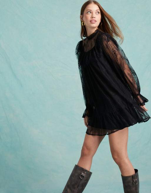 Miss Selfridge – Czarna luźna sukienka z koronką i falbankami