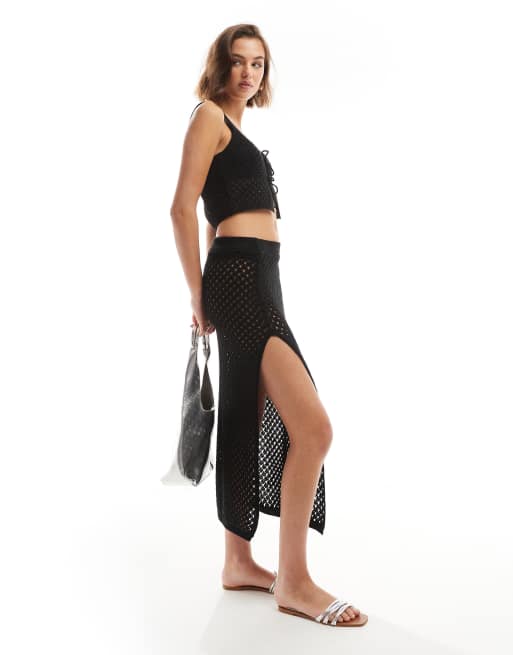 Miss Selfridge – Czarna szydełkowana spódnica maxi z rozcięciem