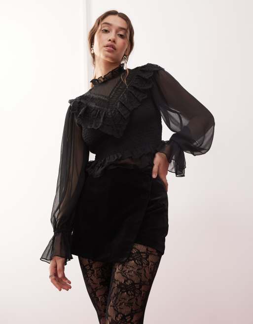 Miss Selfridge – Czarne aksamitne spódnicospodnie z ozdobnymi guzikami i kopertowym przodem
