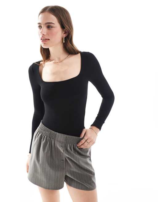 Miss Selfridge – Czarne body z długim rękawem i dekoltem karo