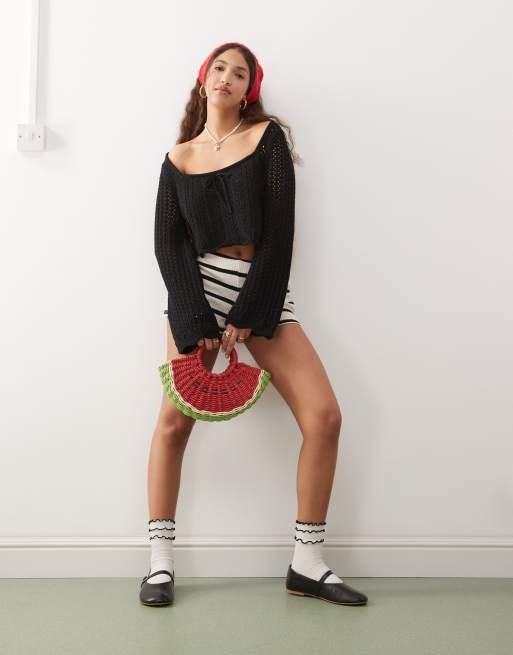 Miss Selfridge – Czarny sweter z szydełkowanej dzianiny z długim rękawem i dekoltem karo