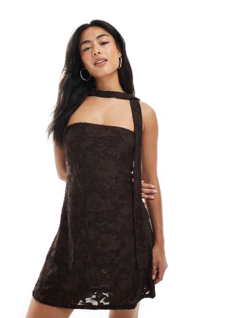 Miss Selfridge – Czekoladowa koronkowa sukienka mini z ozdobnym szalem