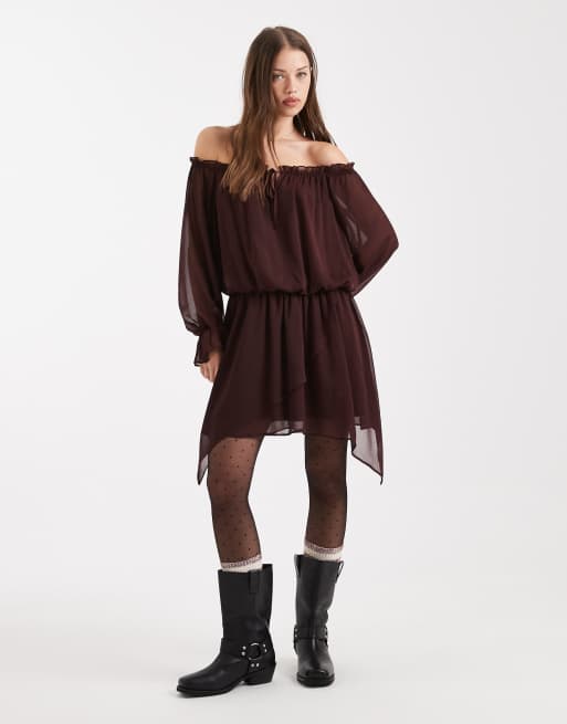 Miss Selfridge – Czekoladowa szyfonowa sukienka z dekoltem bardot i asymetrycznym dołem