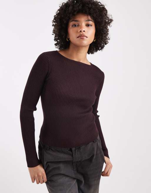 Miss Selfridge – Czekoladowy prążkowany top z długimi rękawami i prostym dekoltem