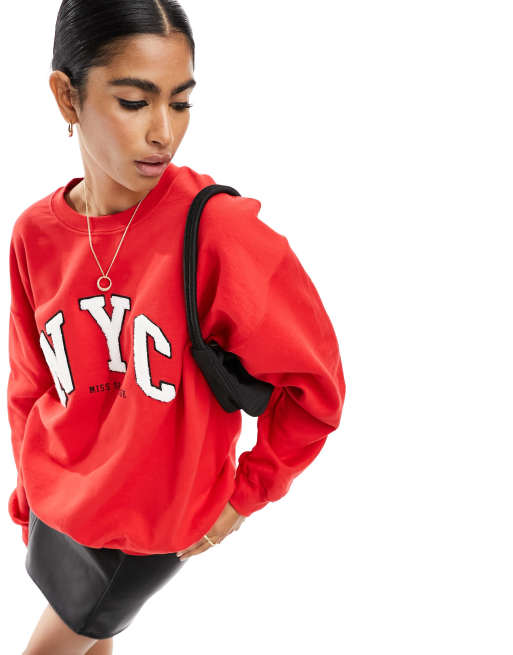 Miss Selfridge – Czerwona bluza oversize z napisem „NYC” z kożuszka