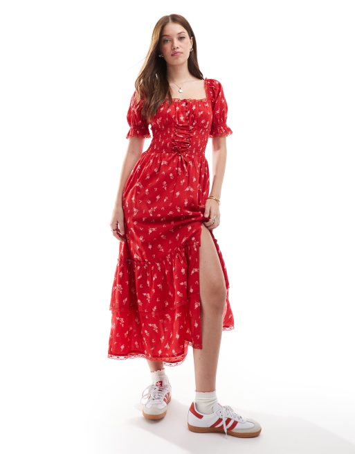 Miss Selfridge – Czerwona gorsetowa sukienka kaskadowa maxi we wzór w róże