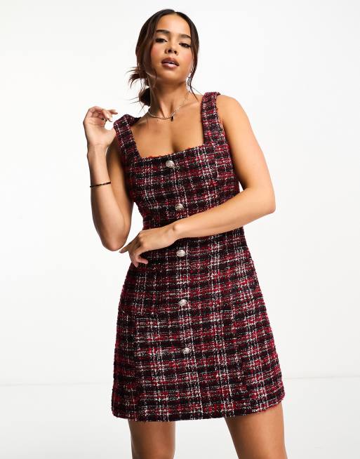 Miss Selfridge – Czerwona sukienka na szelkach z dzianiny boucle w kratkę