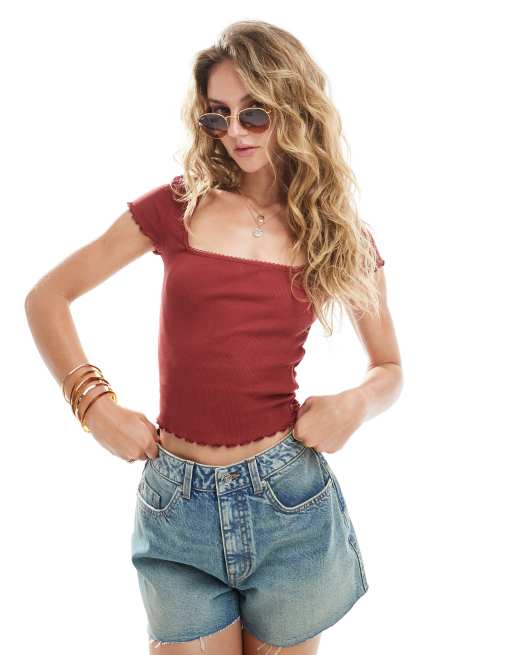 Miss Selfridge – Czerwony prążkowany top z krótkimi rękawami i koronką