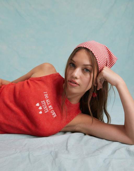 Miss Selfridge– Czerwony top bez rękawów z efektem sprania i napisem „I Do All My Own Stunts”