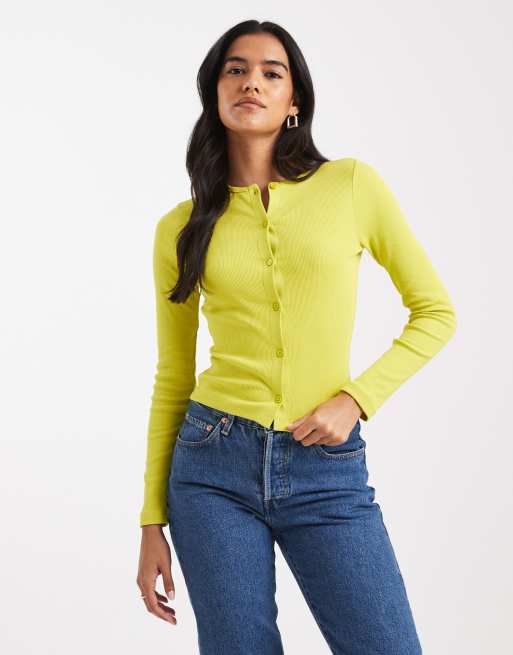 Miss Selfridge – Dopasowany prążkowany kardigan z długimi rękawami w limonkowym kolorze