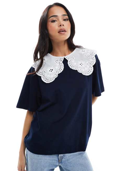Miss Selfridge – Granatowy T-shirt z kołnierzykiem marynarskim z koronką