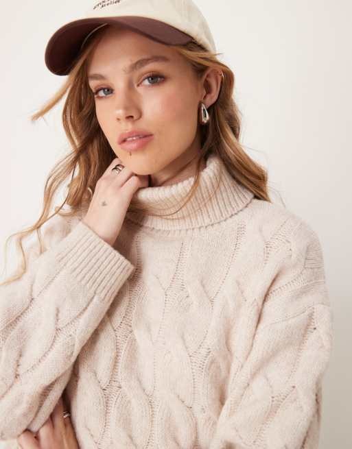 Miss Selfridge – Jasnobeżowy miękki sweter z golfem z dzianiny o warkoczowym splocie