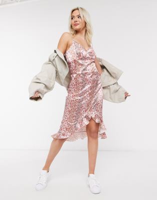 Miss Selfridge – Jasnoróżowa satynowa sukienka midi w kwiaty