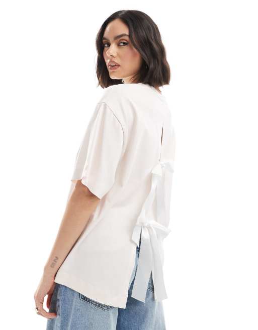 Miss Selfridge – Jasnoróżowy T-shirt oversize z satynowymi dużymi kokardami na plecach