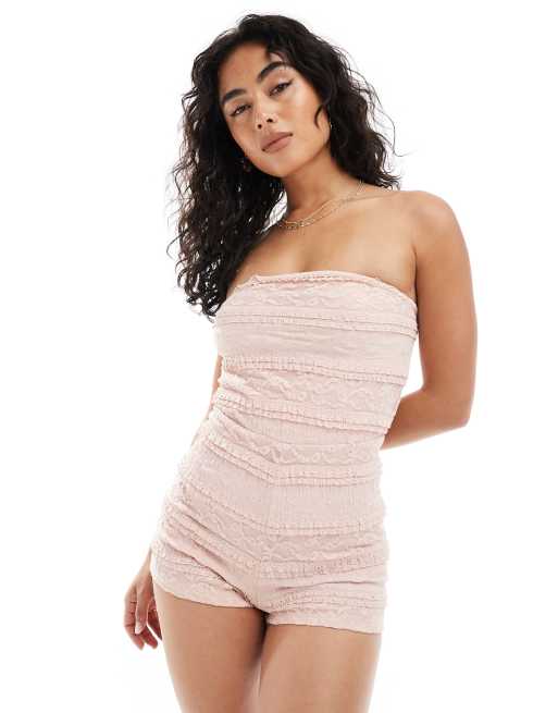 Miss Selfridge – Jasnoróżowy teksturowany kombinezon bandeau z falbankami