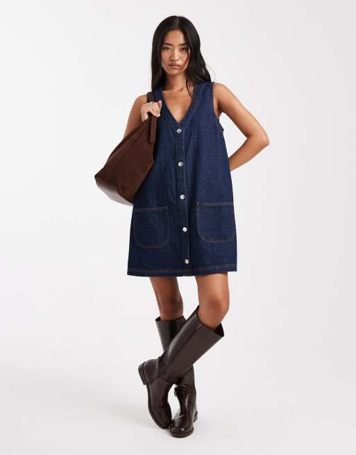 Miss Selfridge – Jeansowa sukienka na szelkach z naszywanymi kieszeniami